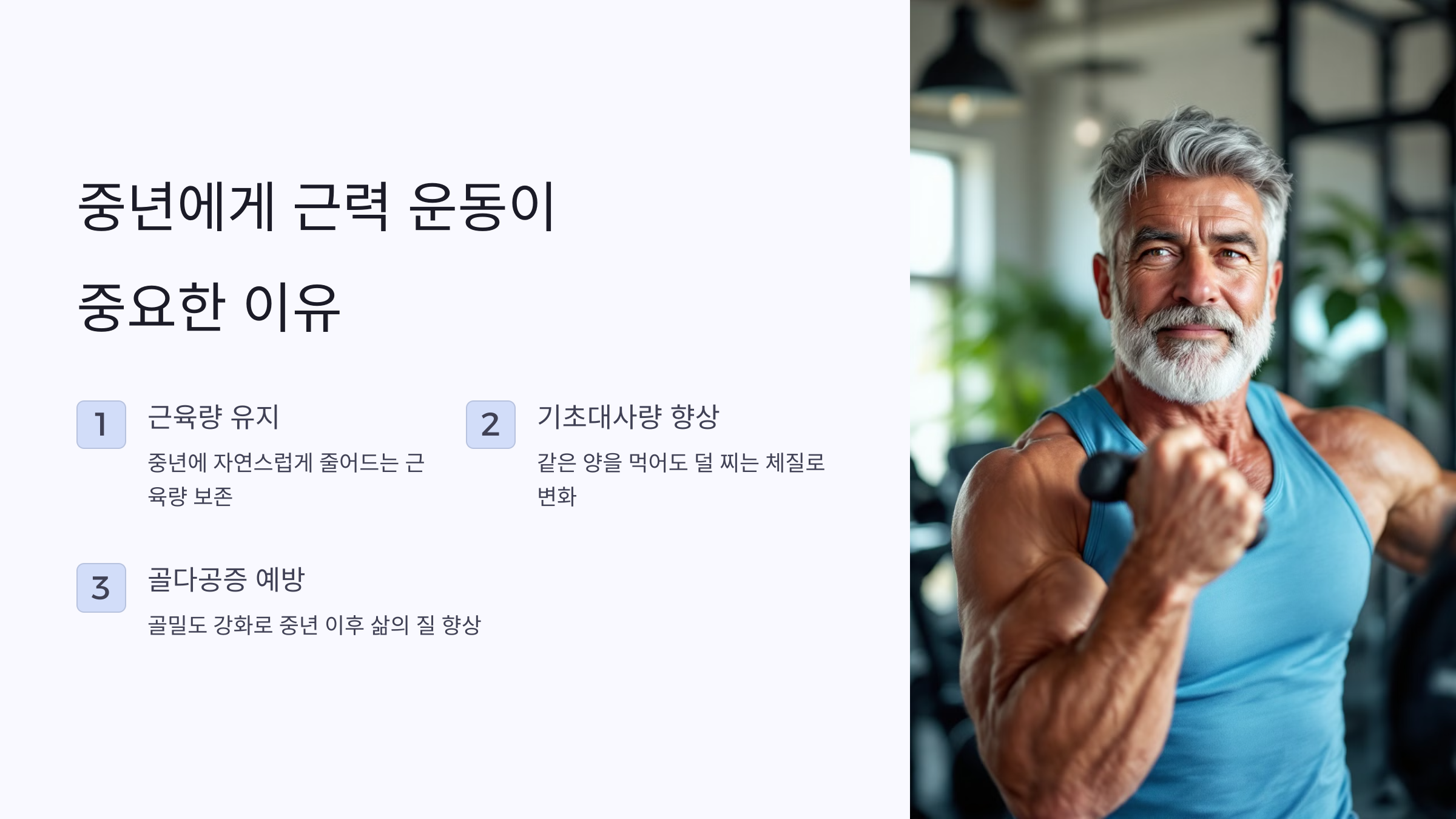 중년에 접어들면 자연스럽게 근육량이 줄어들어요. 근력 운동을 하면 근육을 유지하고, 기초대사량을 높여서 같은 양을 먹어도 덜 찌는 체질로 바꿔준답니다. 솔직히 처음엔 힘들었지만 꾸준히 해보니 확실히 일상생활에서도 활력이 생기더라고요. 특히 골다공증 예방과 관절 건강에도 좋아서 중년 이후 삶의 질이 확실히 올라갑니다.