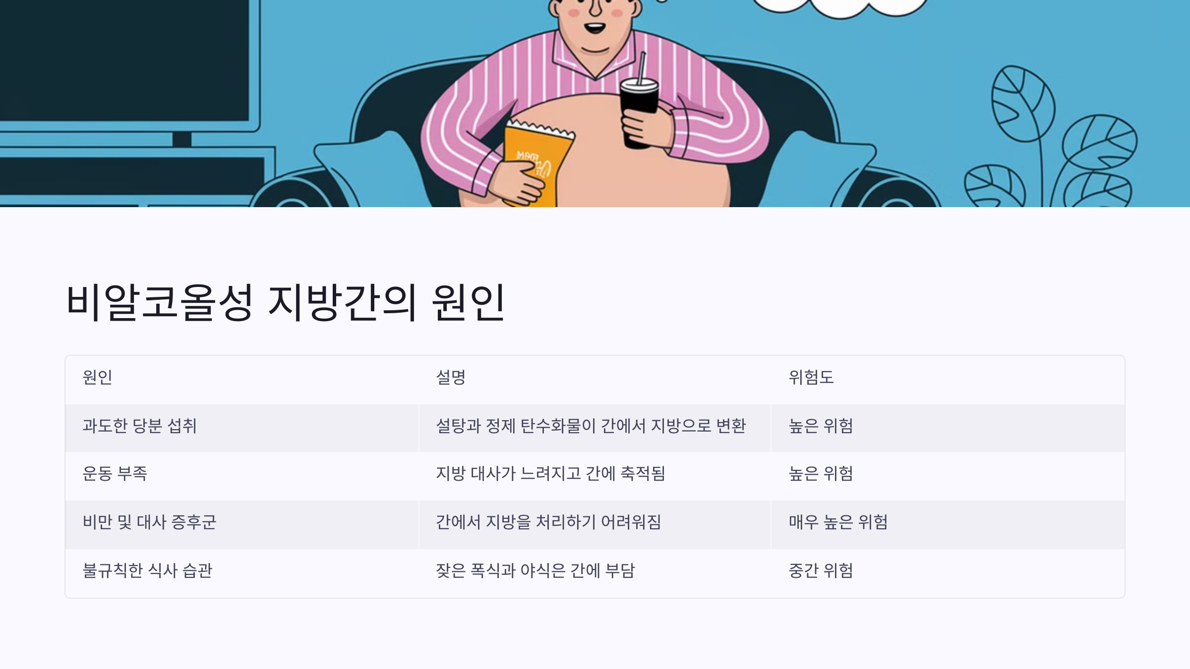 | 원인 | 설명 | 지방간 발생 위험 |