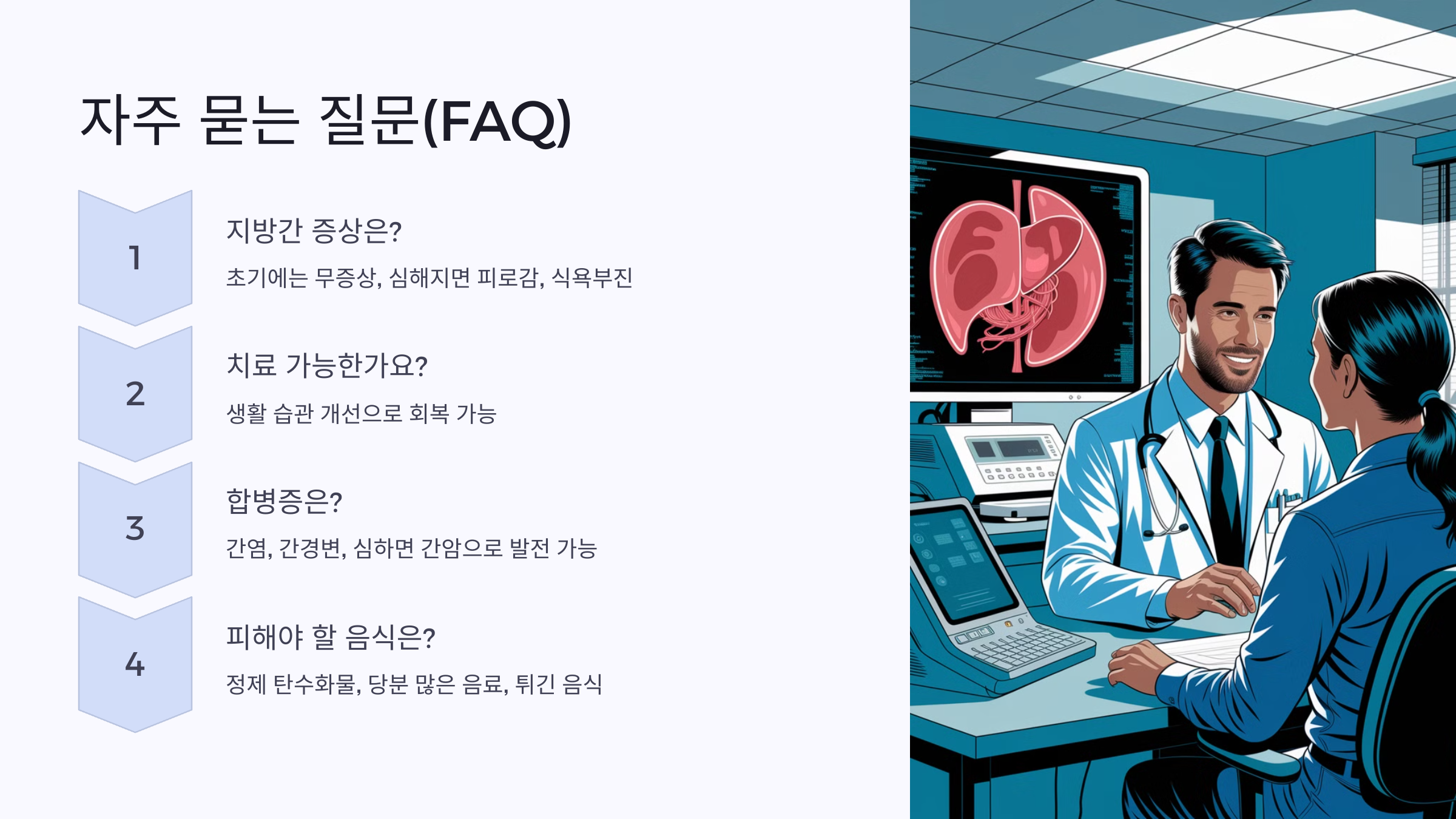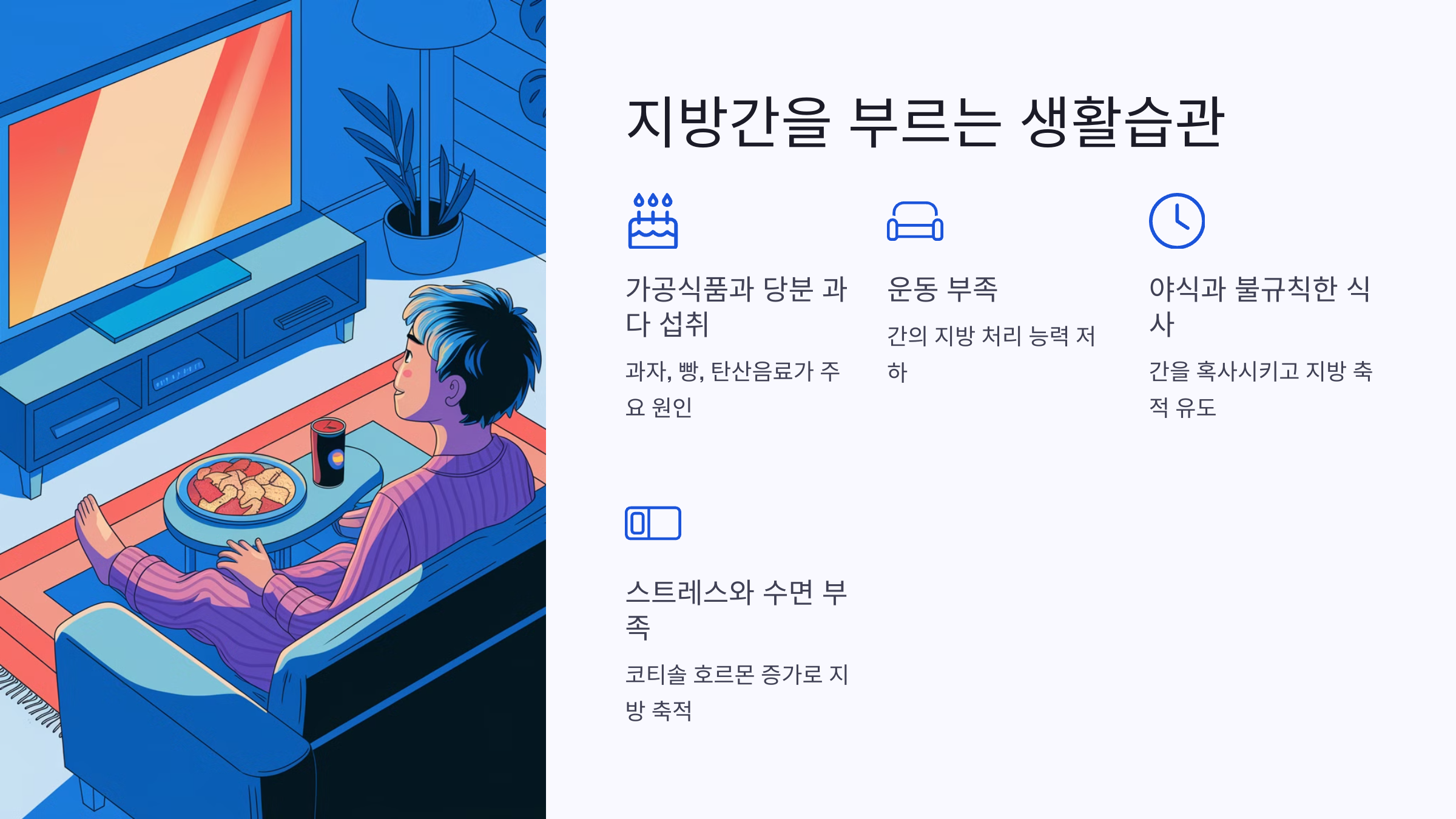 이처럼 비알코올성 지방간은 단순히 술 때문이 아니라, 우리가 매일 실천하는 생활습관과 밀접한 관련이 있습니다. 그렇다면, 지방간을 부르는 생활습관에는 어떤 것들이 있을까요? 다음 섹션에서 자세히 살펴보겠습니다.