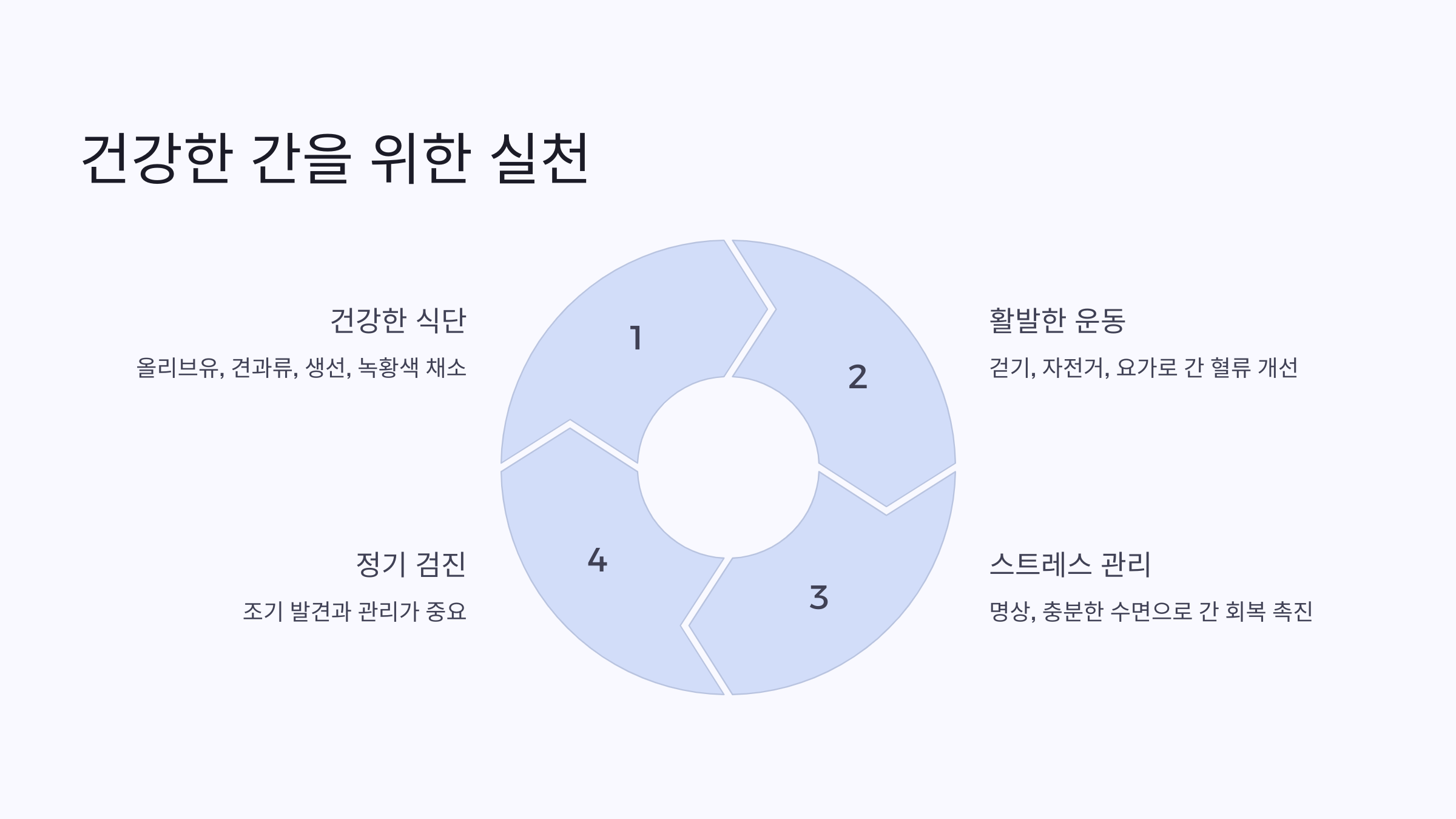 스트레스와 수면 부족은 간 건강을 해치는 요인 중 하나입니다. 규칙적인 생활 습관을 유지하며 간이 회복할 수 있는 시간을 확보하세요.