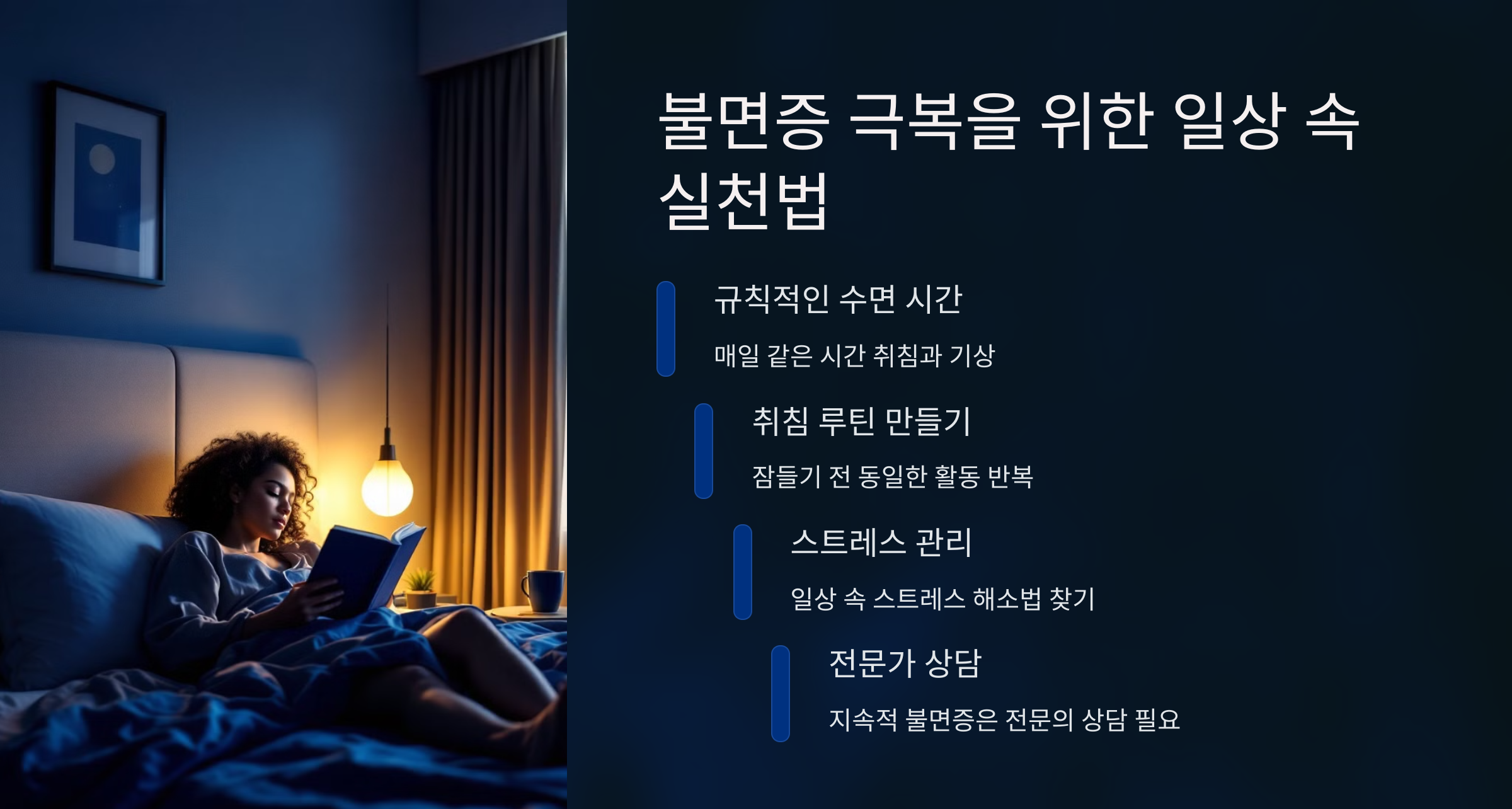 불면증을 극복하려면 작은 습관부터 바꾸는 게 제일 좋아요. 사소해 보여도 효과가 뛰어난 방법들이 많거든요. 아래의 간단한 방법들을 매일 실천해 보세요.