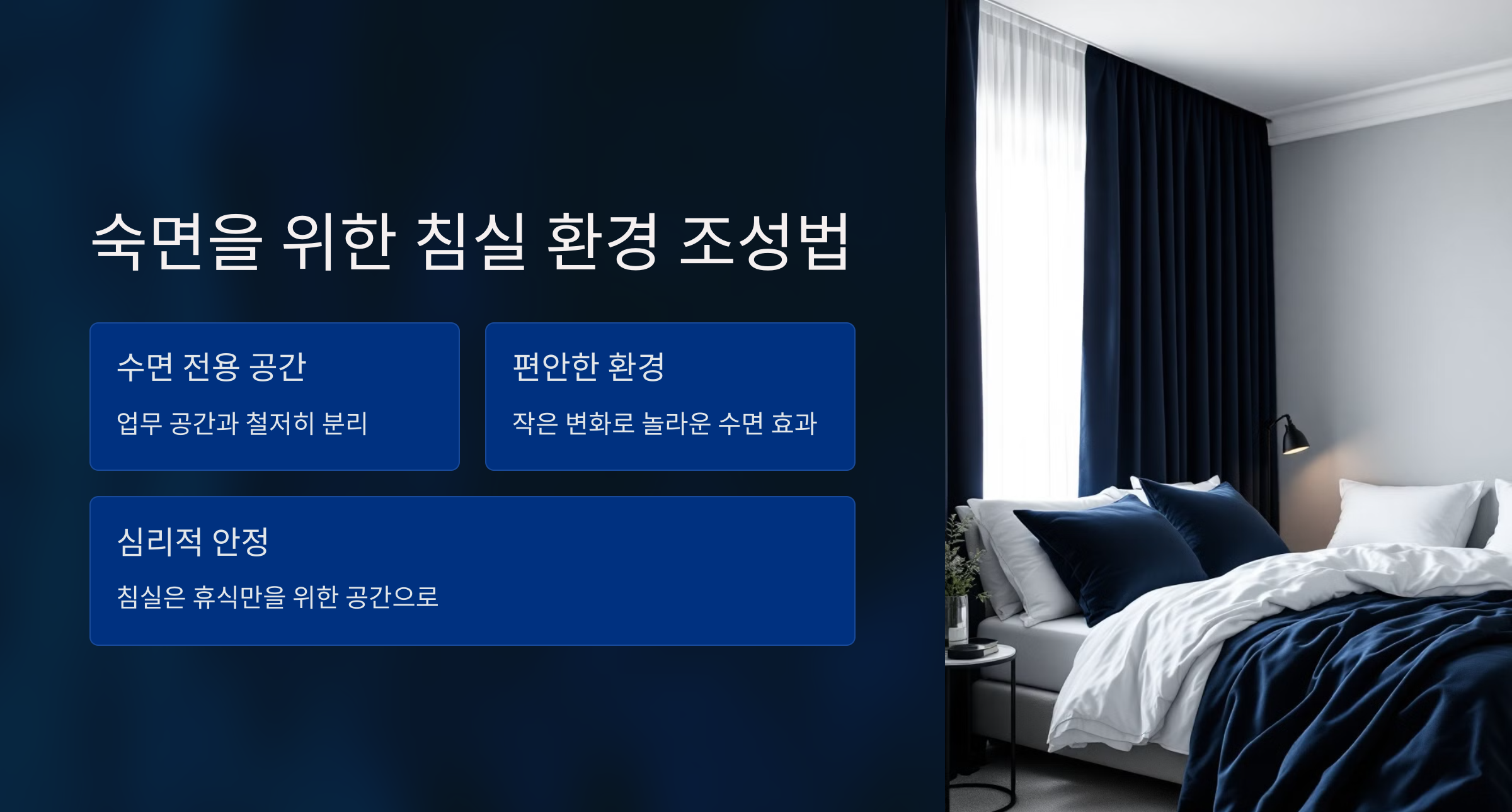 침실 환경을 어떻게 꾸미느냐에 따라 수면의 질이 크게 달라져요. 너무 당연한 이야기처럼 들리겠지만, 작은 변화만으로도 놀라운 차이를 경험할 수 있답니다. 특히 침실은 오직 수면을 위한 공간으로 만들 필요가 있어요. 업무 공간과 철저히 분리해 심리적인 편안함을 만들어보세요.