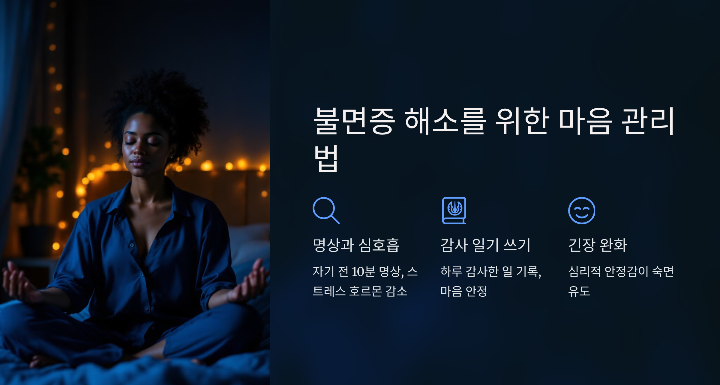 | 명상과 심호흡 | 자기 전 10분의 명상은 스트레스 호르몬을 줄이고 긴장을 완화해 숙면을 돕습니다. | ⭐⭐⭐⭐⭐ |